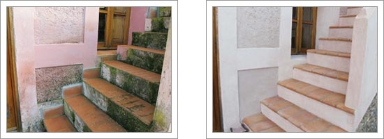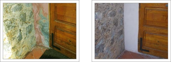 Risanamento delle murature umide mediante realizzazione di barriera alla risalita capillare con Easy Gel, impermeabilizzazione della muratura con BZ 6 RS impermeabilizzante traspirante resistente ai sali, applicazione del antisale Spritz RS e a seguire Into Base intonaco deumidificante macroporoso e RD Lime rasante traspirante. Per evitare l’effetto bagnato, tutta la muratura esterna è stata trattata con Silox idrorepellente sillossanico.